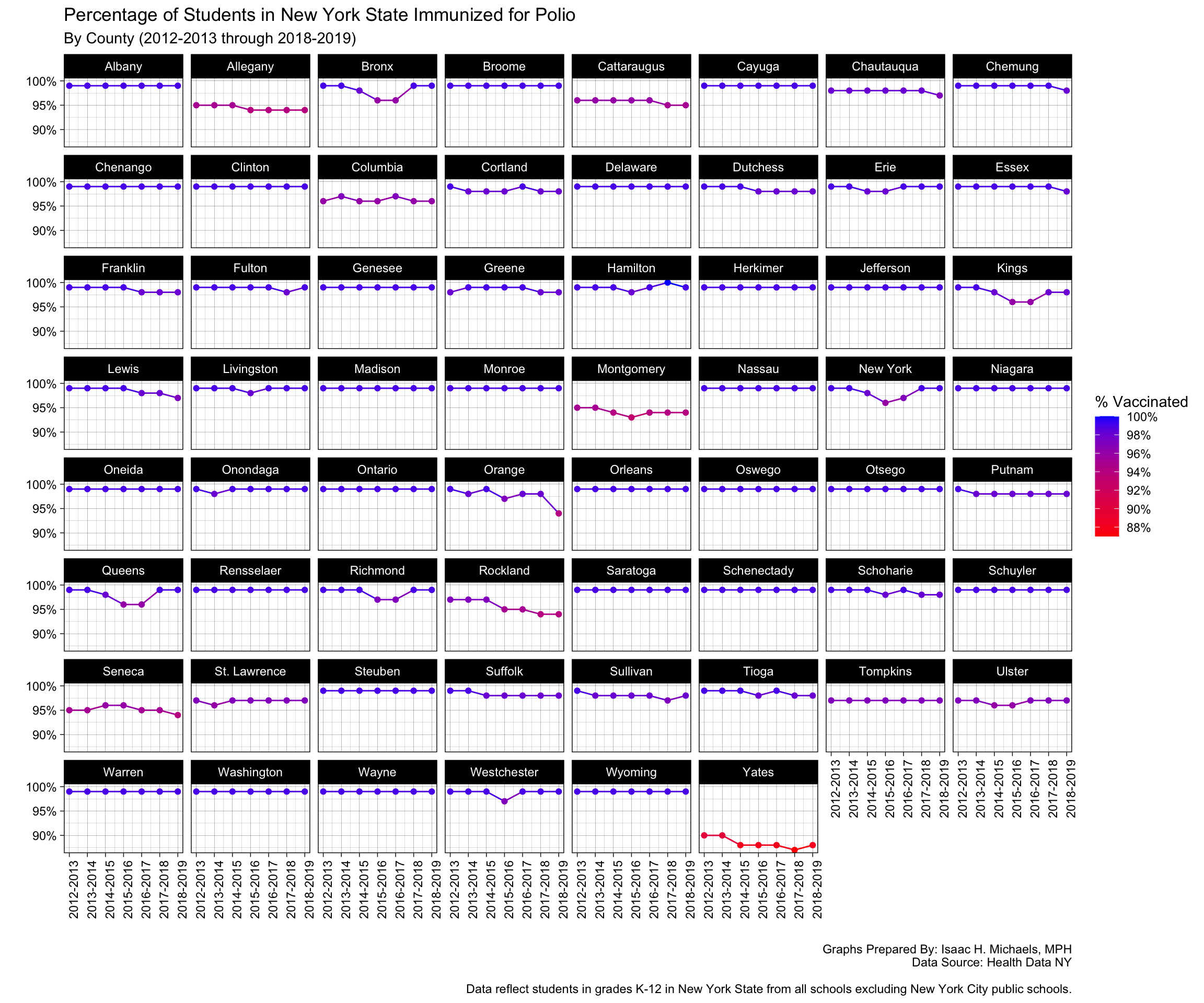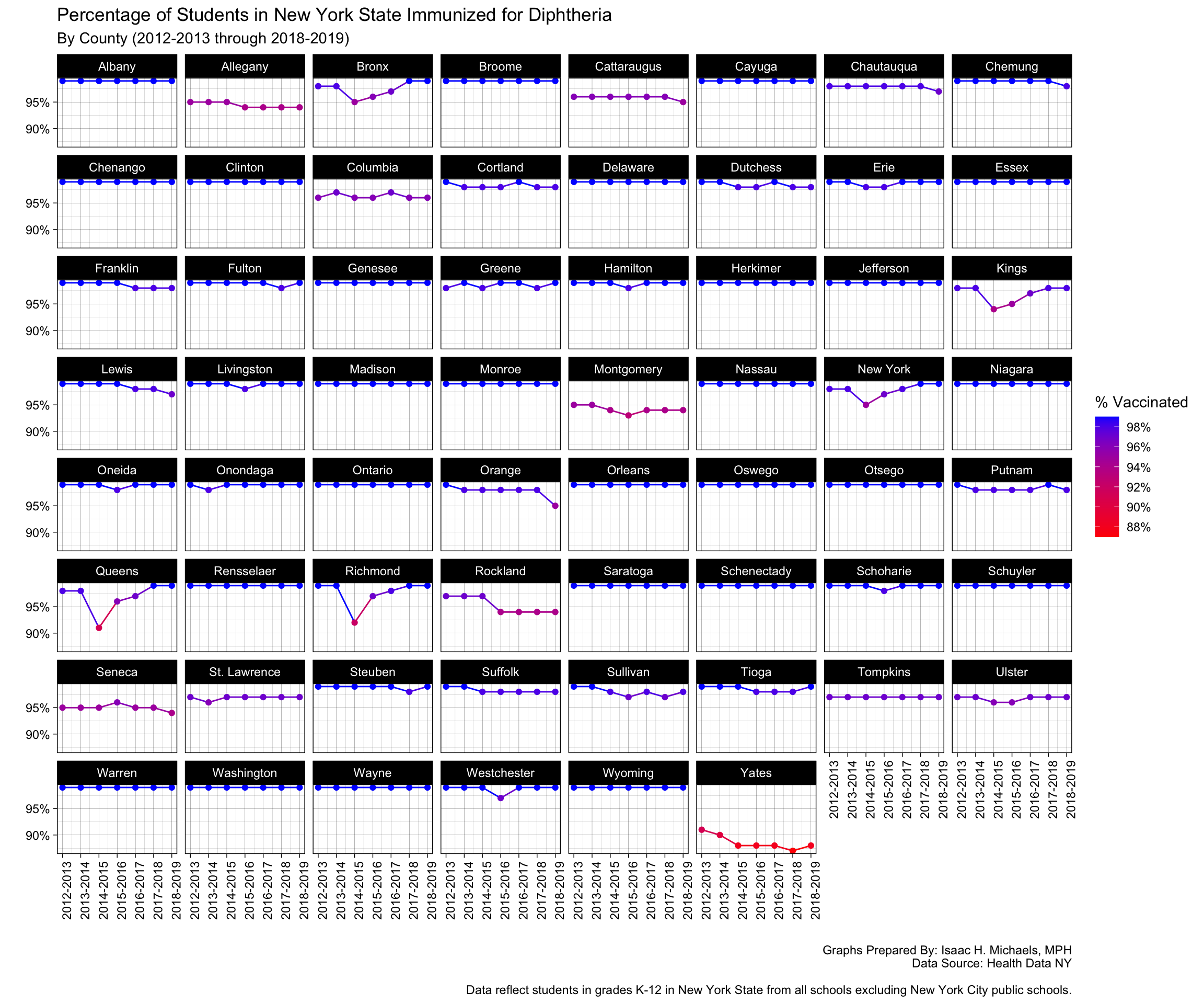 Welcome to my data analysis of immunization levels among schools in New York State. This page presents a cross-sectional choropleth map alongside longitudinal trend graphs arrayed by county for each of the following vaccine-uptake indicators: complete vaccination, Diphtheria vaccination, Hepatitis B vaccination, Measles vaccination, Mumps vaccination, Polio vaccination, Rubella vaccination, and Varicella vaccination. The data used in this analysis come from the New York State Department of Health via the Health Data NY open data platform, and covers the period beginning with the 2012-13 school year.