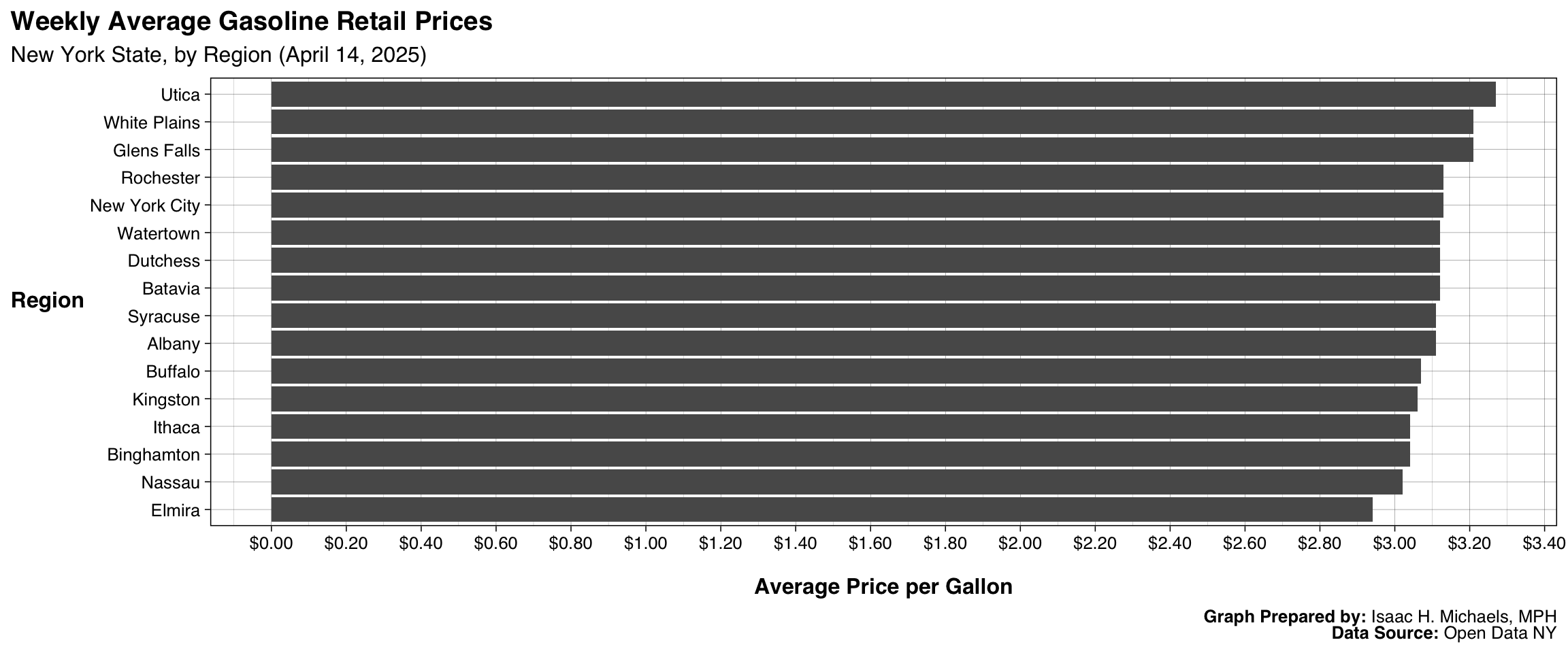The New York State Energy Research and Development Authority has compiled a dataset on weekly average retail gasoline prices for New York State and 16 metropolitan regions in the state. The data, which span from October 2007 to the present, are collected from the American Automobile Association’s Daily Fuel Gauge Report and are provided in U.S. dollars per gallon.