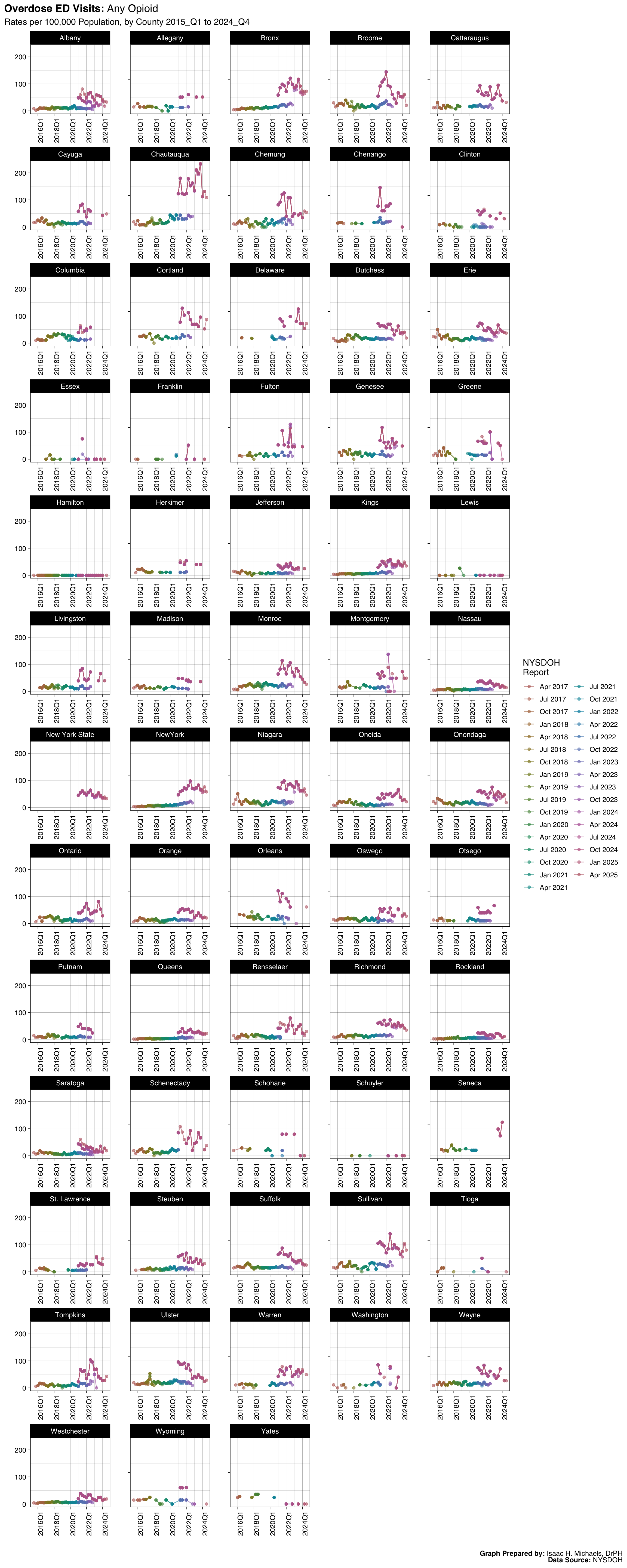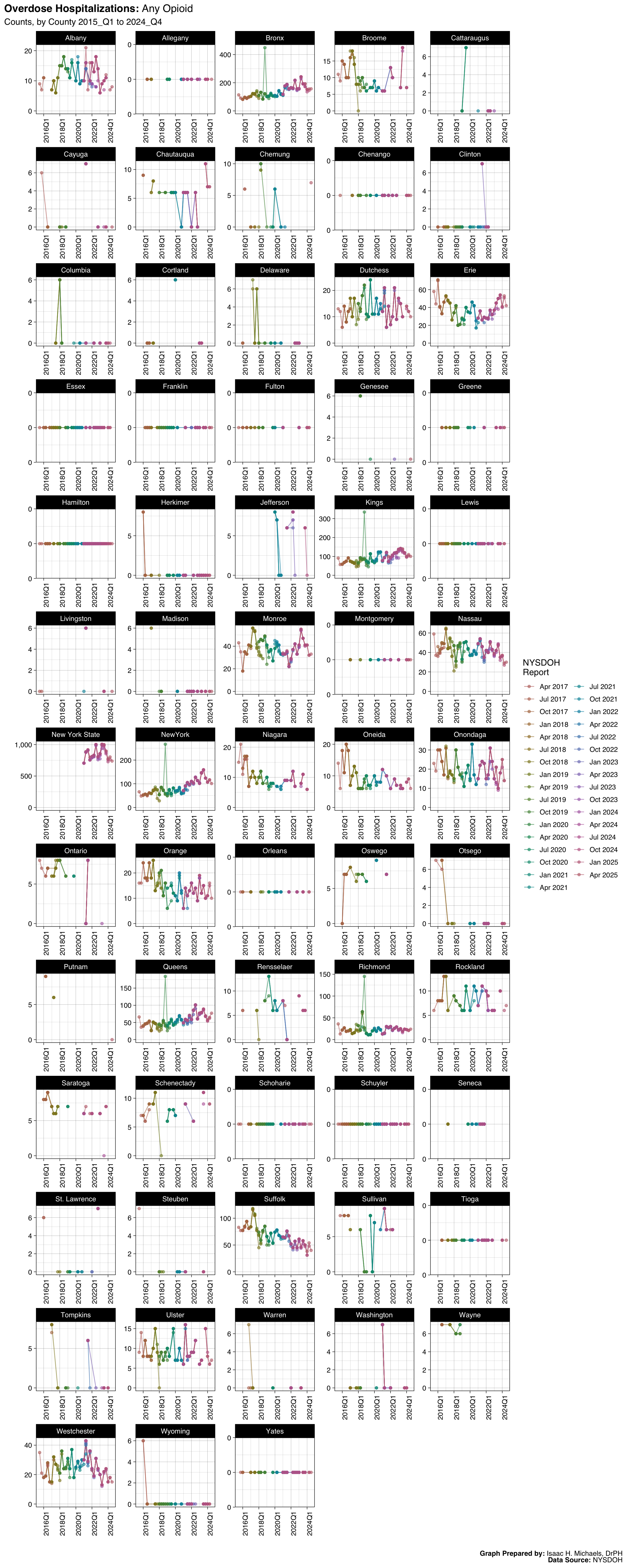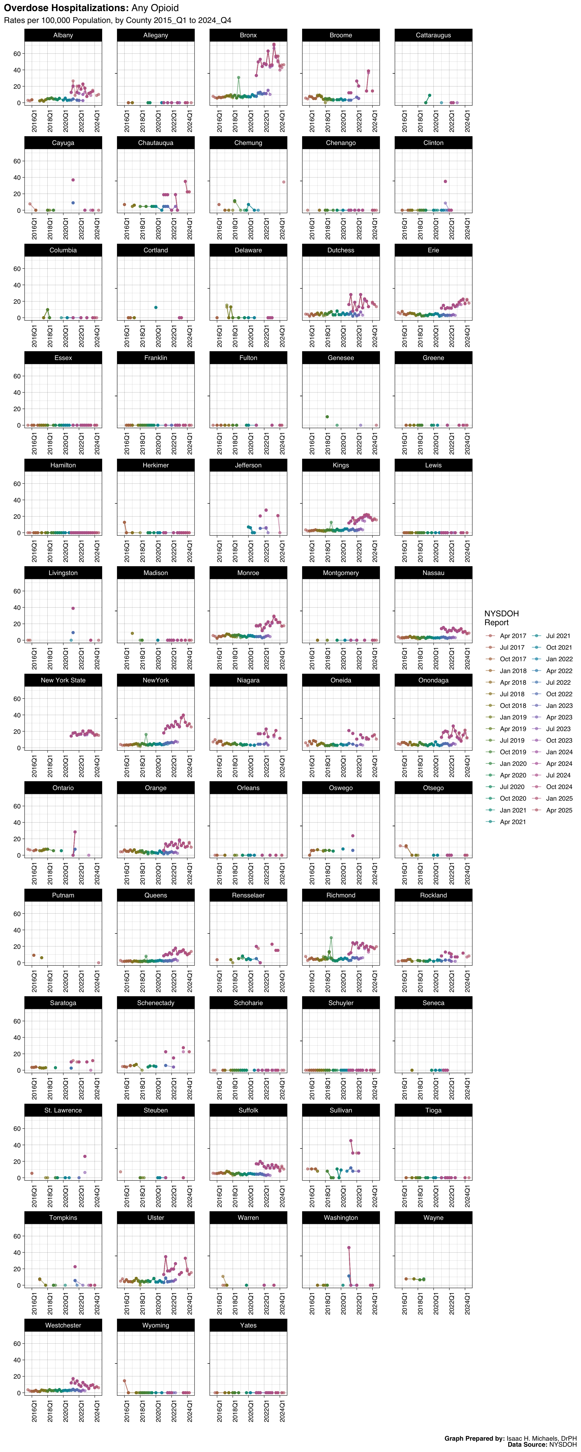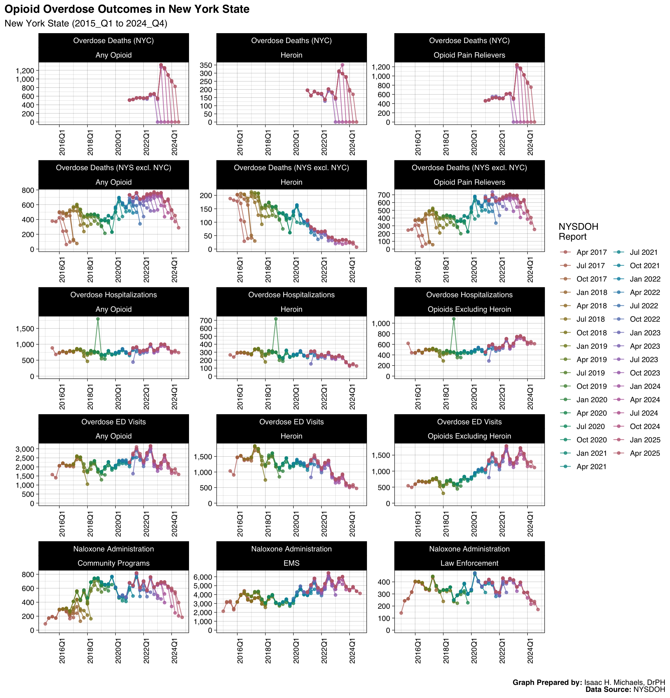 Welcome to this page, where I present data analyses on opioid overdoses in New York State. The data presented on this webpage include quarterly counts and rates for deaths, hospitalizations, emergency department visits, and naloxone administrations by EMS, law enforcement, and community programs. The data are broken down by indicators such as overdose deaths involving any opioid, overdose deaths involving heroin, and overdose deaths involving opioid pain relievers. The data presented are obtained from the New York State Opioid Data Quarterly Reports by the New York State Department of Health, beginning with the April 2017 report.