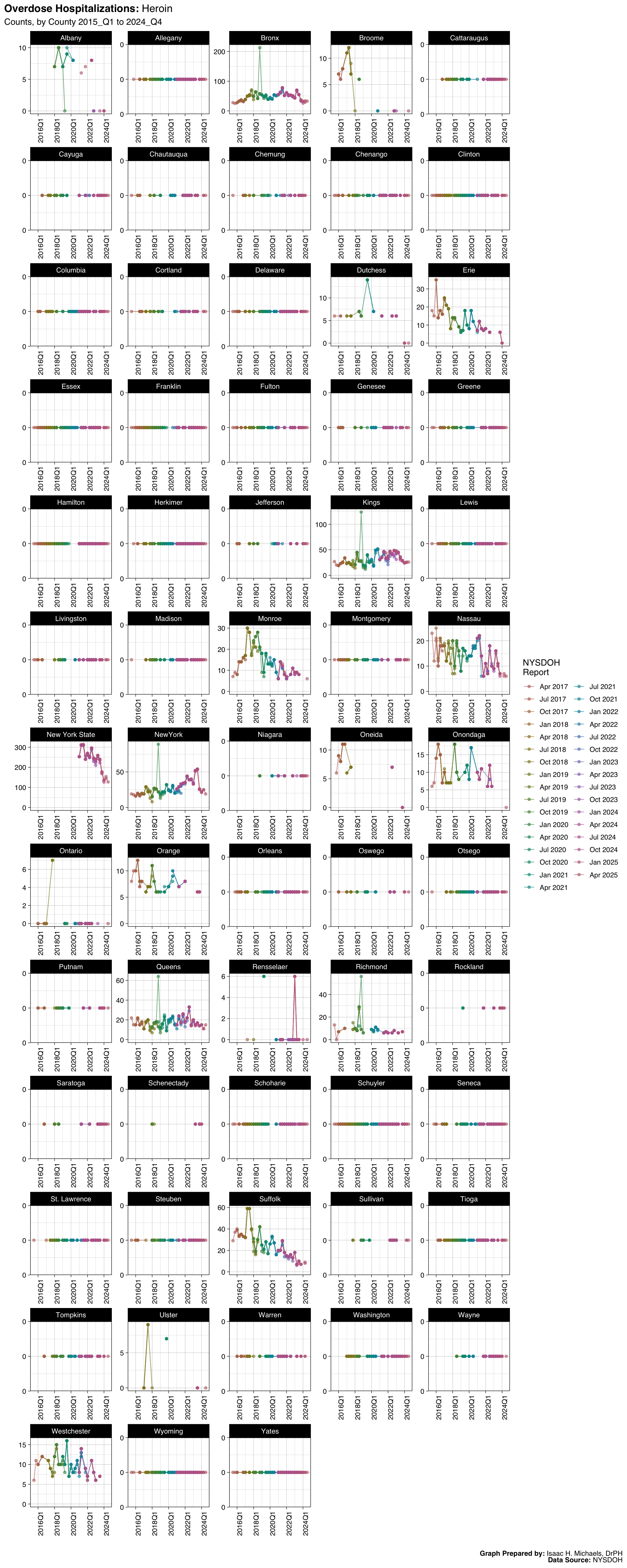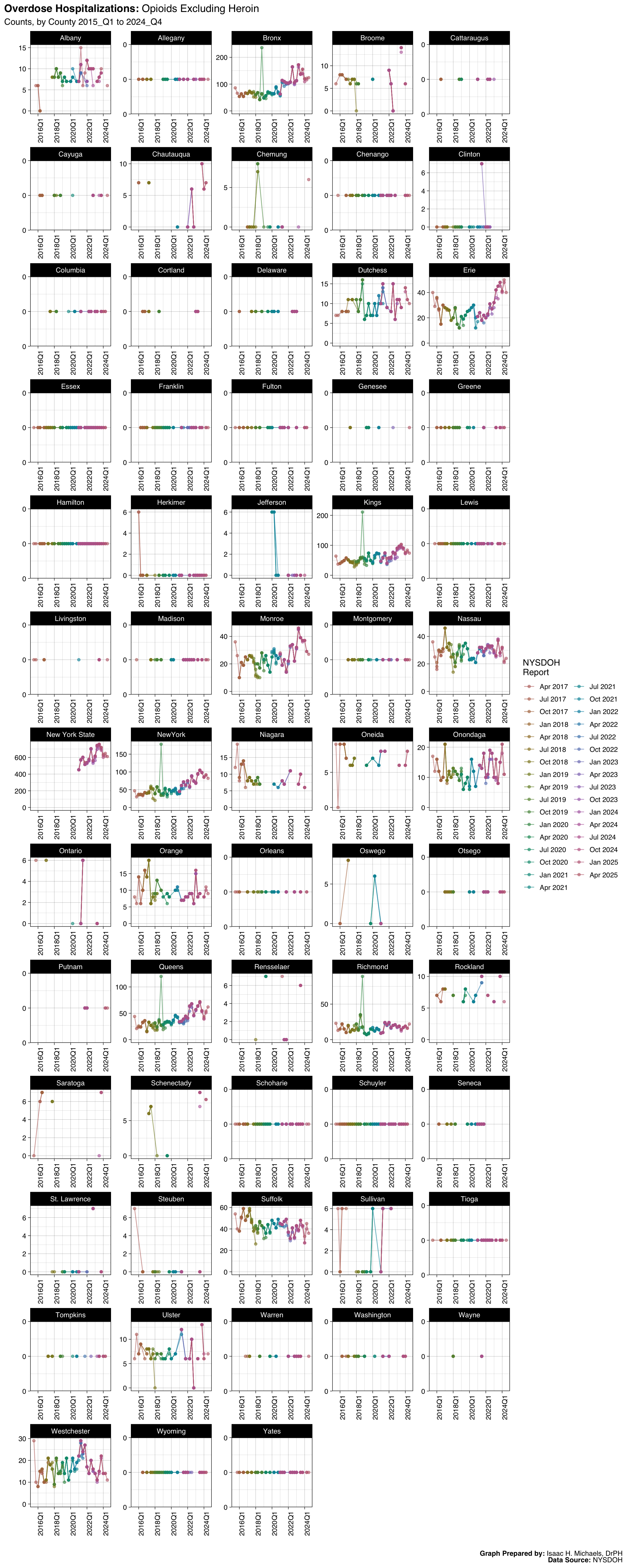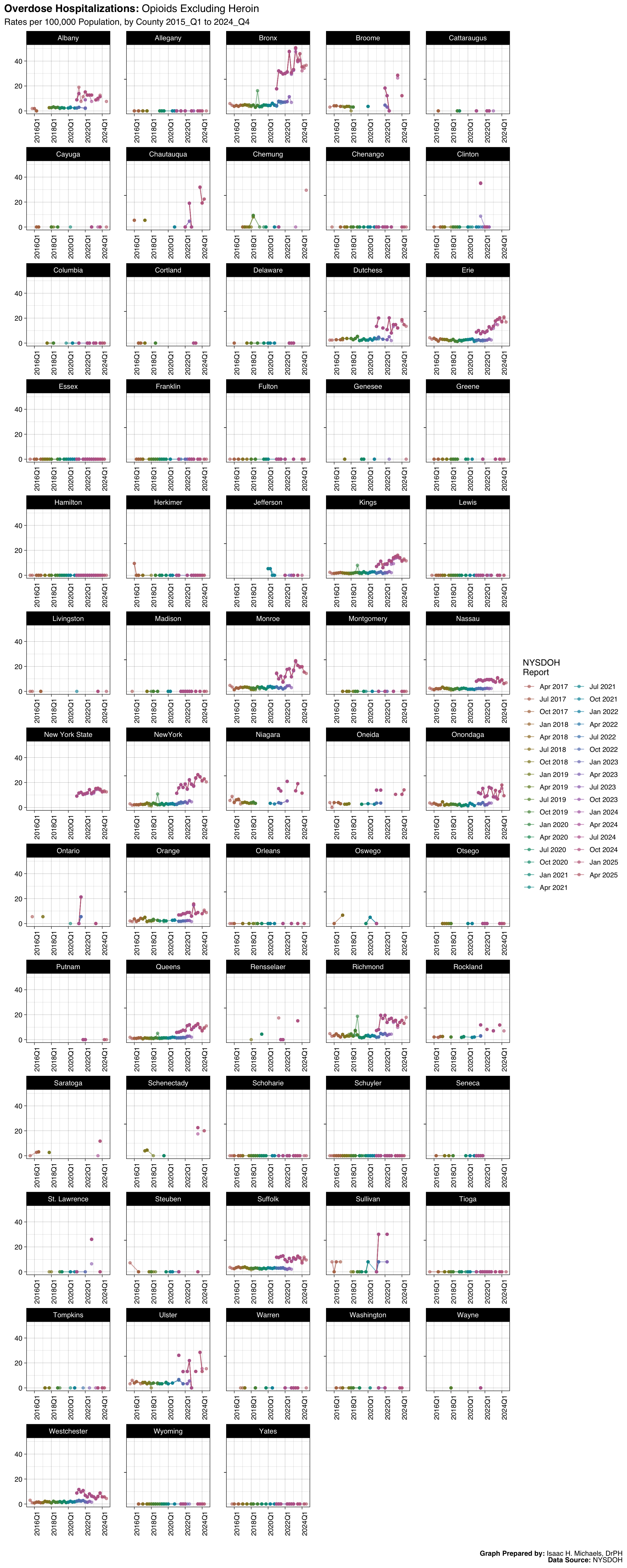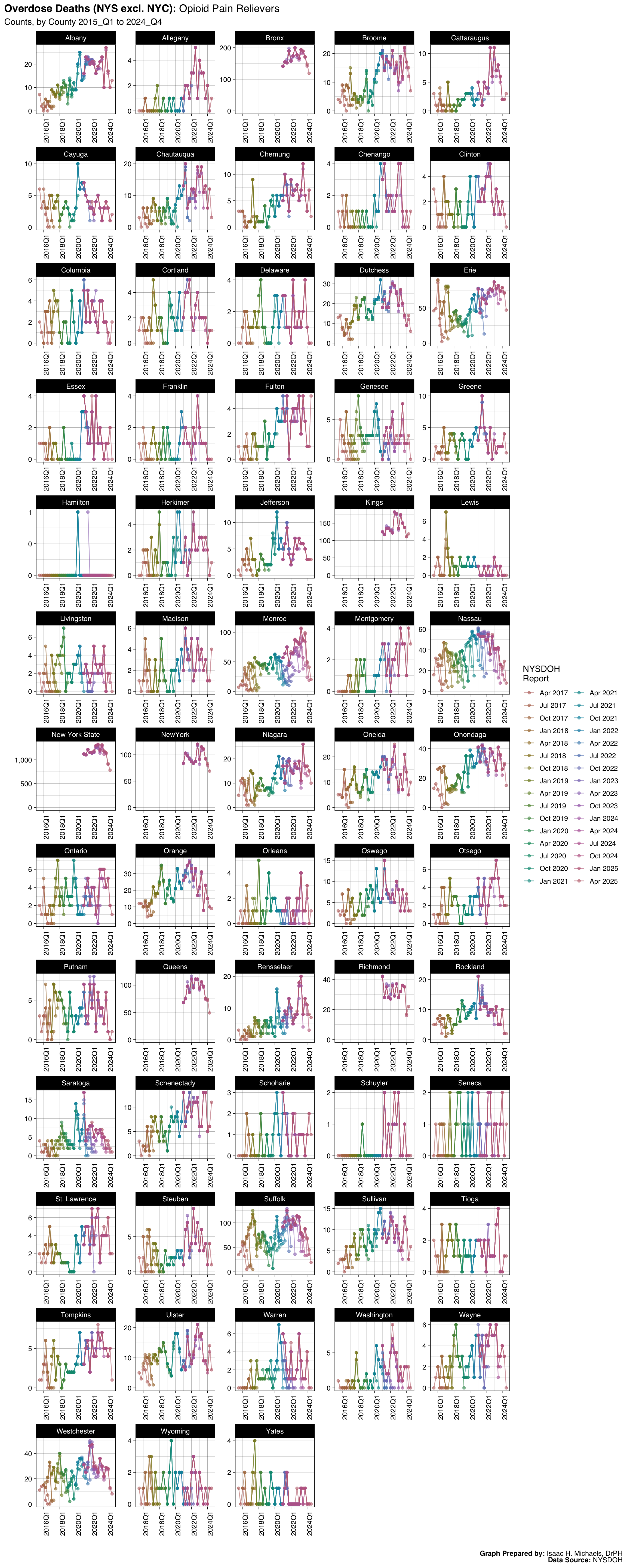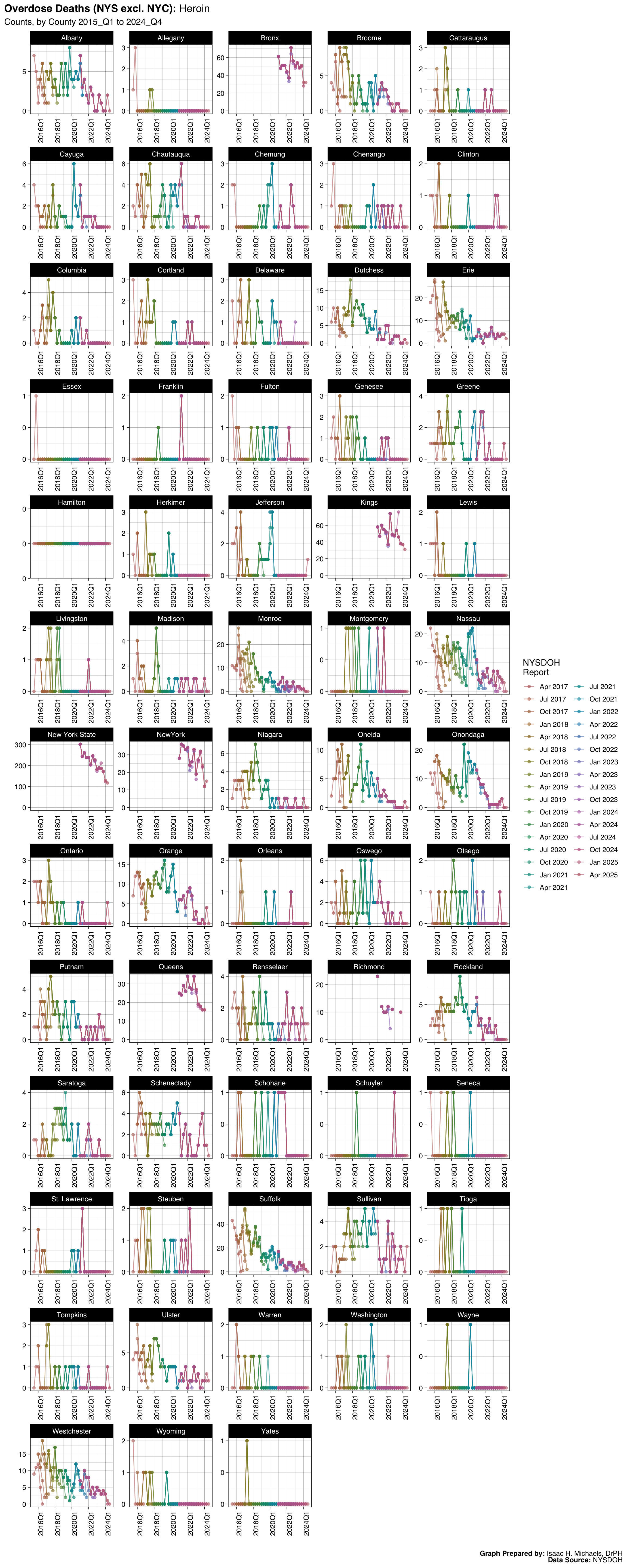 Welcome to this page, where I present data analyses on opioid overdoses in New York State. The data presented on this webpage include quarterly counts and rates for deaths, hospitalizations, emergency department visits, and naloxone administrations by EMS, law enforcement, and community programs. The data are broken down by indicators such as overdose deaths involving any opioid, overdose deaths involving heroin, and overdose deaths involving opioid pain relievers. The data presented are obtained from the New York State Opioid Data Quarterly Reports by the New York State Department of Health, beginning with the April 2017 report.