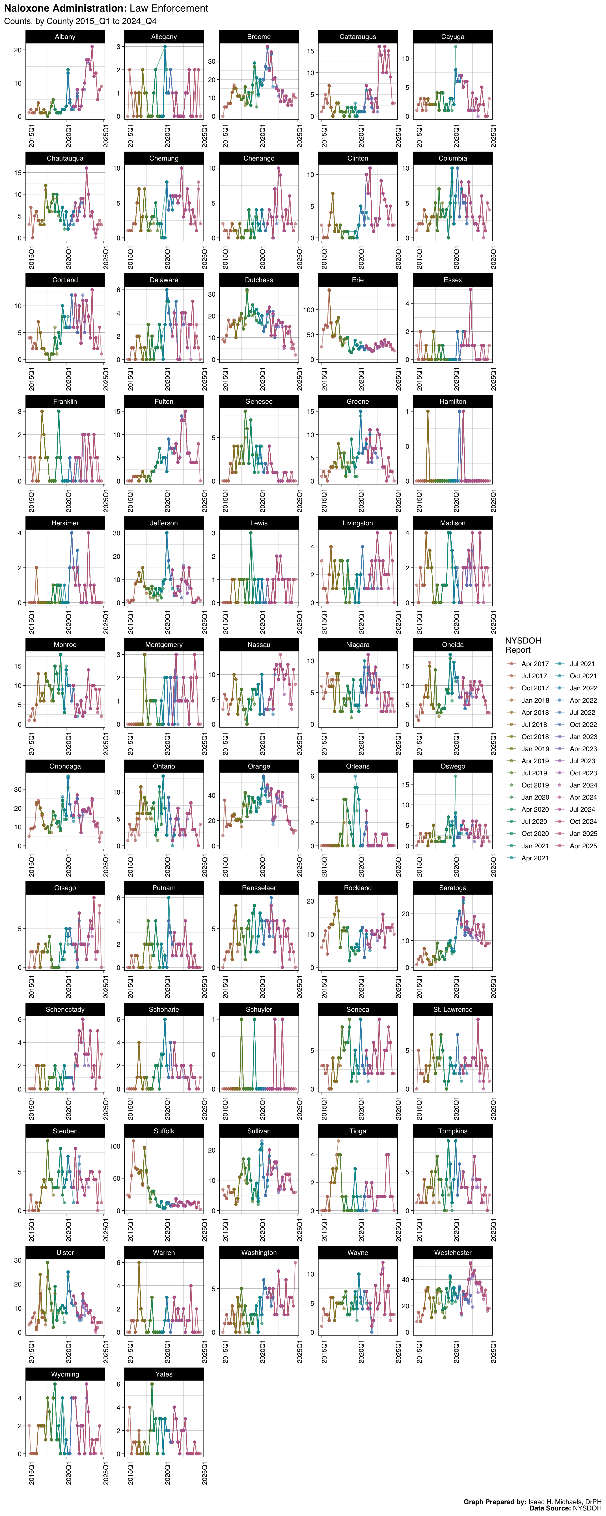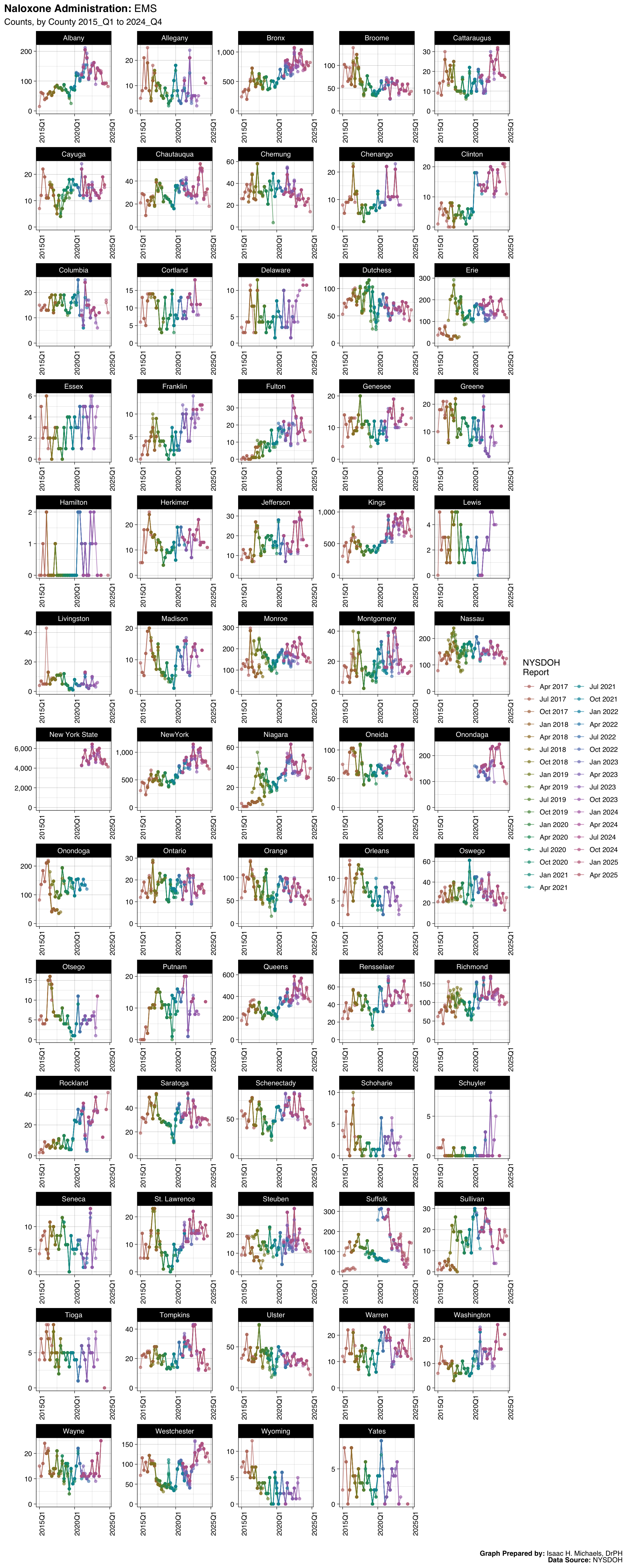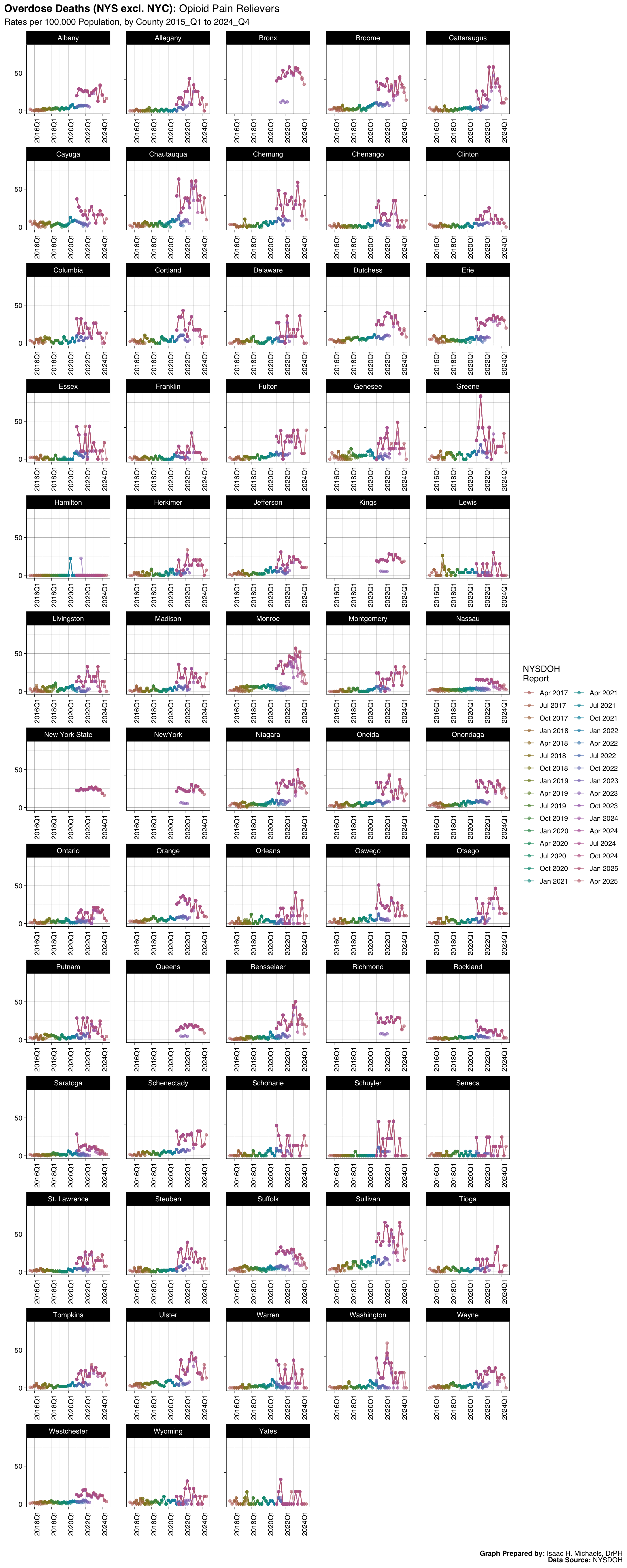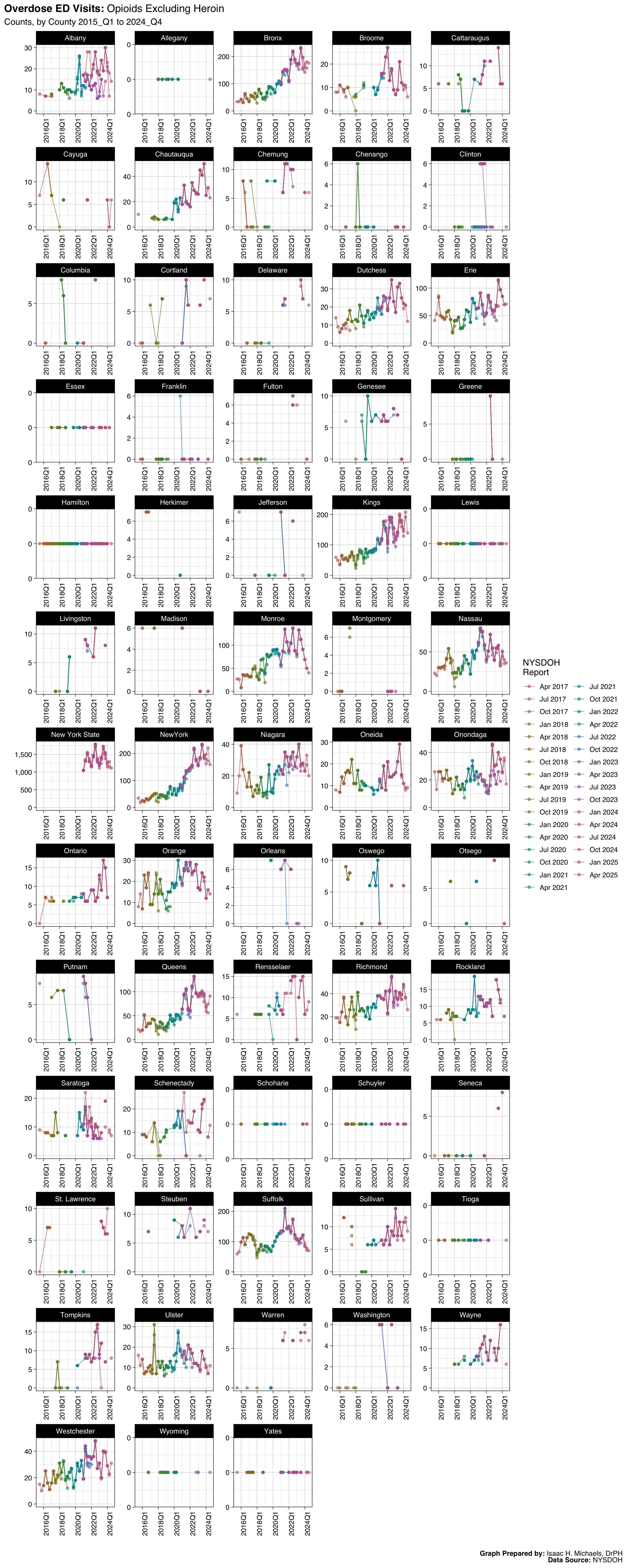 Welcome to this page, where I present data analyses on opioid overdoses in New York State. The data presented on this webpage include quarterly counts and rates for deaths, hospitalizations, emergency department visits, and naloxone administrations by EMS, law enforcement, and community programs. The data are broken down by indicators such as overdose deaths involving any opioid, overdose deaths involving heroin, and overdose deaths involving opioid pain relievers. The data presented are obtained from the New York State Opioid Data Quarterly Reports by the New York State Department of Health, beginning with the April 2017 report.