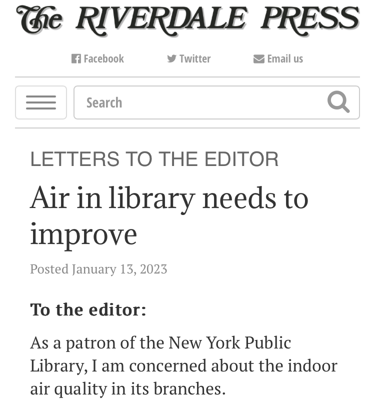 I am proud to announce that my letter addressing the important issue of indoor air quality in New York Public Library branches was published on 1/13/2023 in The Riverdale Press. In this letter, I highlight the dangers of poor indoor air quality, particularly during the ongoing COVID-19 pandemic, and call for the city to install air filtration units in library branches to protect the health and safety of patrons and staff. I also suggest piloting different types of air filters in select branches to determine the most effective and cost-efficient option for the library system.